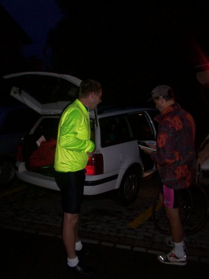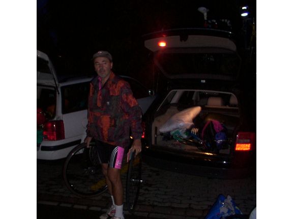 Bernhard am frühen Morgen noch in den kurzen Hosen seines Sponsors am Materialwagen |